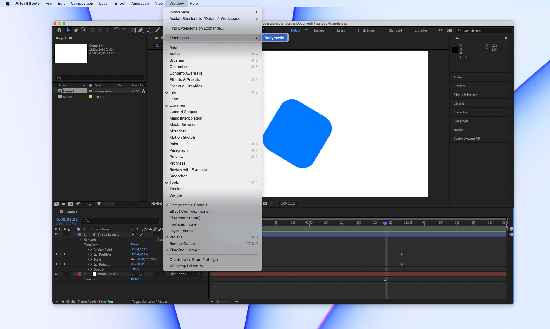 In the After Effects menu, go to Window -> Extensions -> Bodymovin.